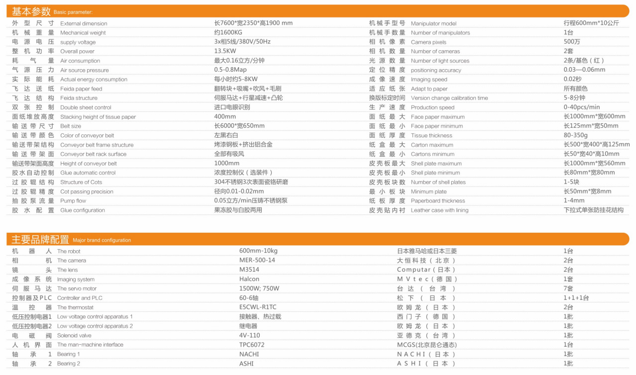 This machine adopts Mitsubishi 600 stroke manipulator, imported camera, Panasonic PLC and other international high-end electrical appliances, with large positioning size, high precision, stable operation, fast speed and strong controllability. It is suitable for all kinds of cartons, leather cases, inner god dog paper feeding, gluing and alignment production, especially the pull-down lining device, which completely solves the scratch problem of leather case. The machine is all independently developed, designed and produced by our company. The servo cam Feida part, glue passing part and durian control part have obtained a number of national patents.
